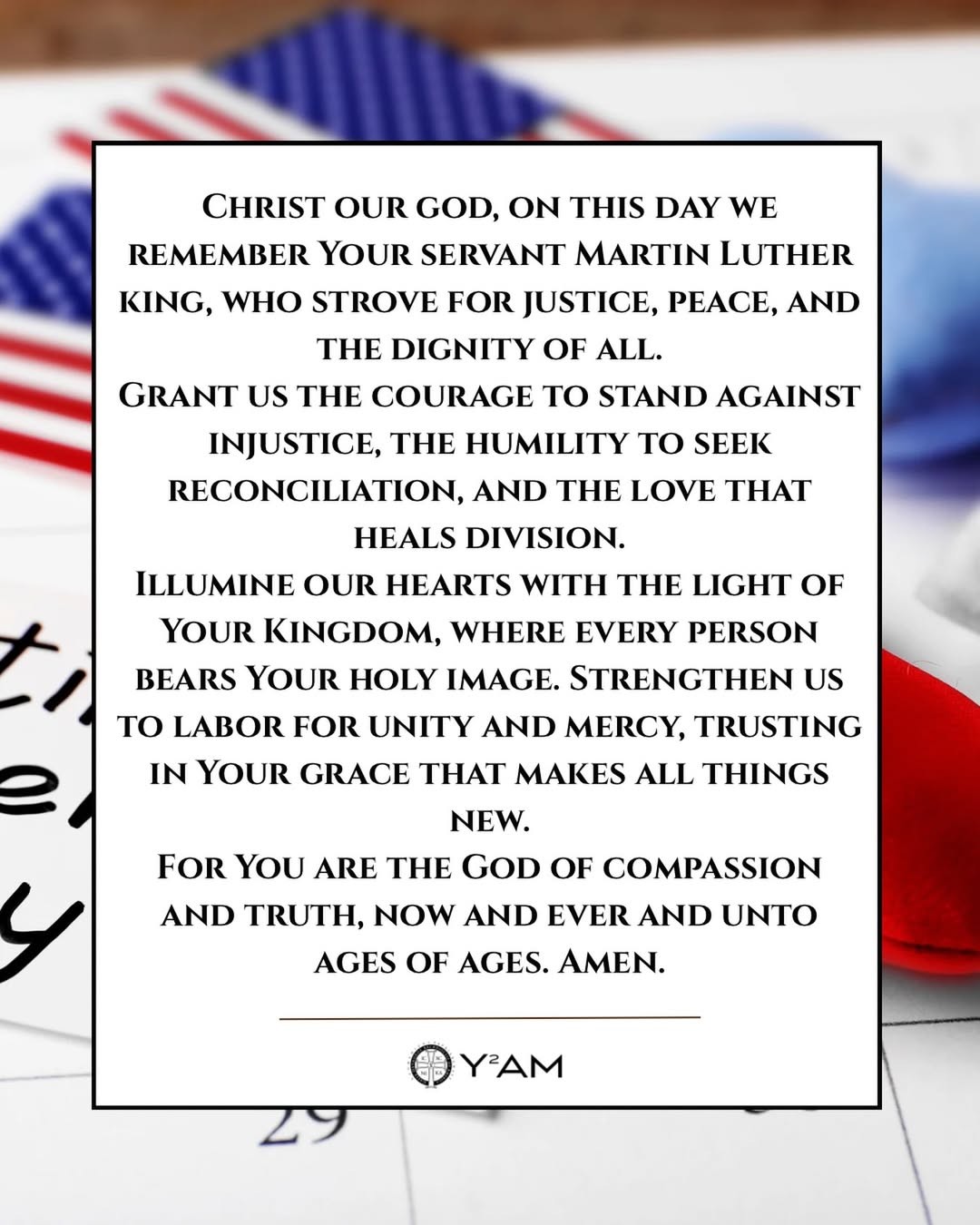 Today, as we remember Dr. Martin Luther King Jr., we see that same unwavering courage echoed in a different age and a different struggle. Both men remind us that defending the image of God in every person is not optional. Rather, it is the work of every Christian. The prayer we offer today calls us to that same path of justice, mercy, and reconciliation. It challenges us to resist division, to speak truth with humility, and to love even when it costs us something.